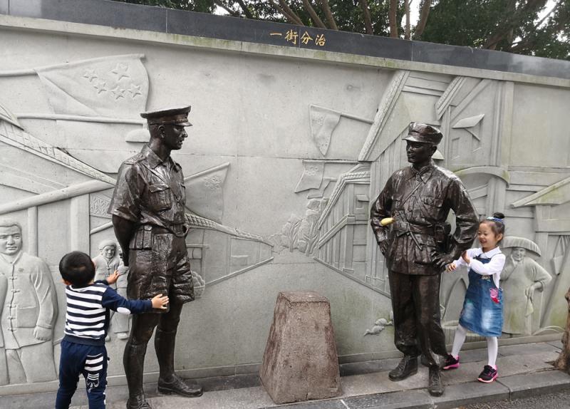 图:中英街双方都尽量把公共服务普及和普惠到深港两地的居民。图为中英街著名的“一街分治”雕塑/大公报记者郭若溪摄
